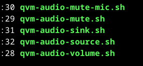 Those scripts are responsible for determining the current vm (based on the currently focused window) and then to call the corresponding script within my audiovm. Additionally those are referenced in the global keyboard shortcut configuration.