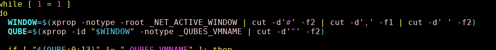 I initially wanted to use your script but I realized that it does not work with the default dom0 installation (not sure what i3 is though⌠:)). Therefore I followed the approach to implement a âwhileâ loop in bash that runs every half a second (sleep 0.5) and extracts the current vm from these calls: