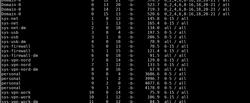 sys-usb and personal are pinned to the performance cores of my processor (https://www.intel.de/content/www/de/de/products/sku/236847/intel-core-ultra-7-processor-155h-24m-cache-up-to-4-80-ghz/specifications.html). My understanding of this whole CPU pinning ist still limited, here are a few questions I have, maybe somebody can answer: