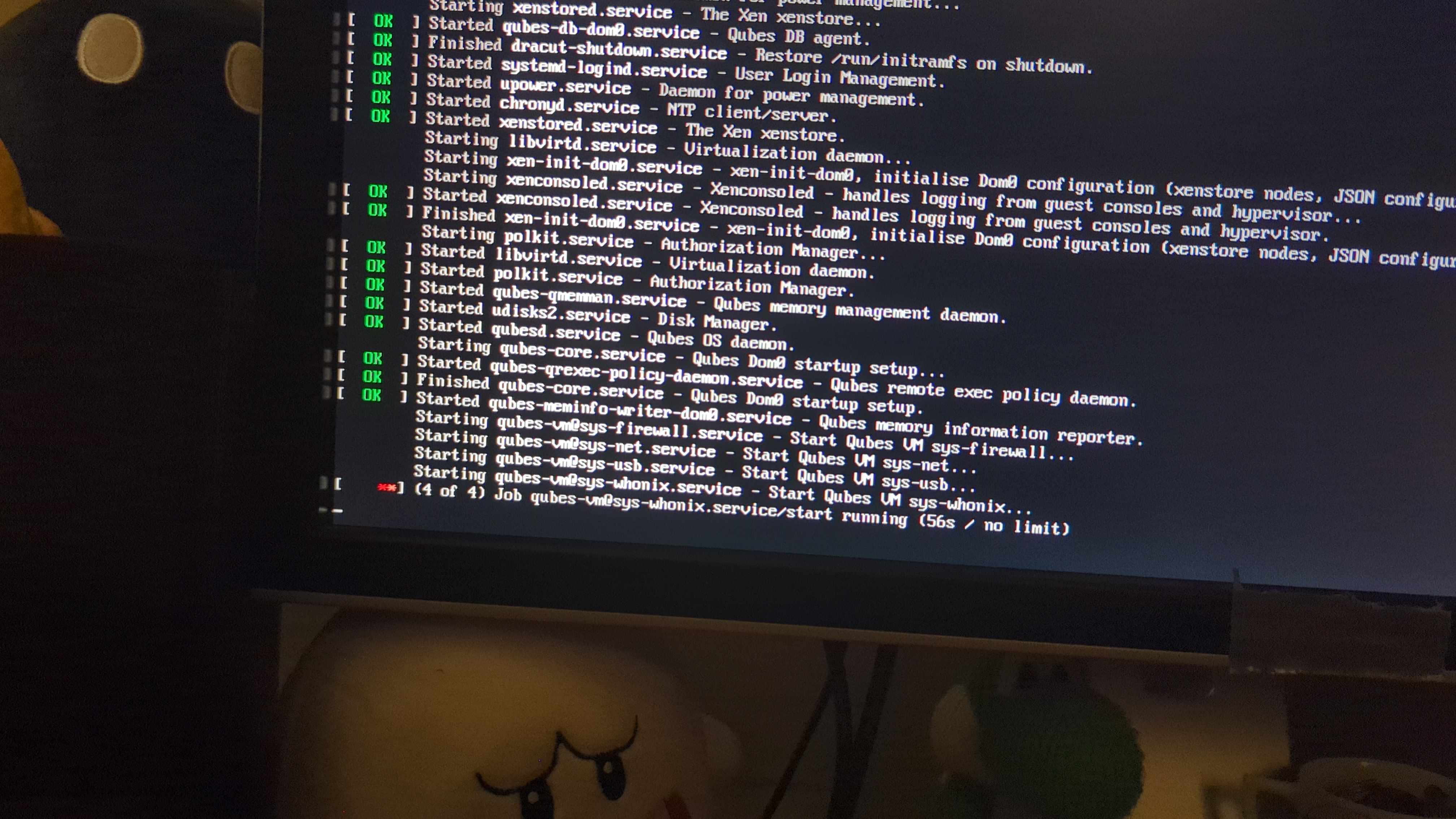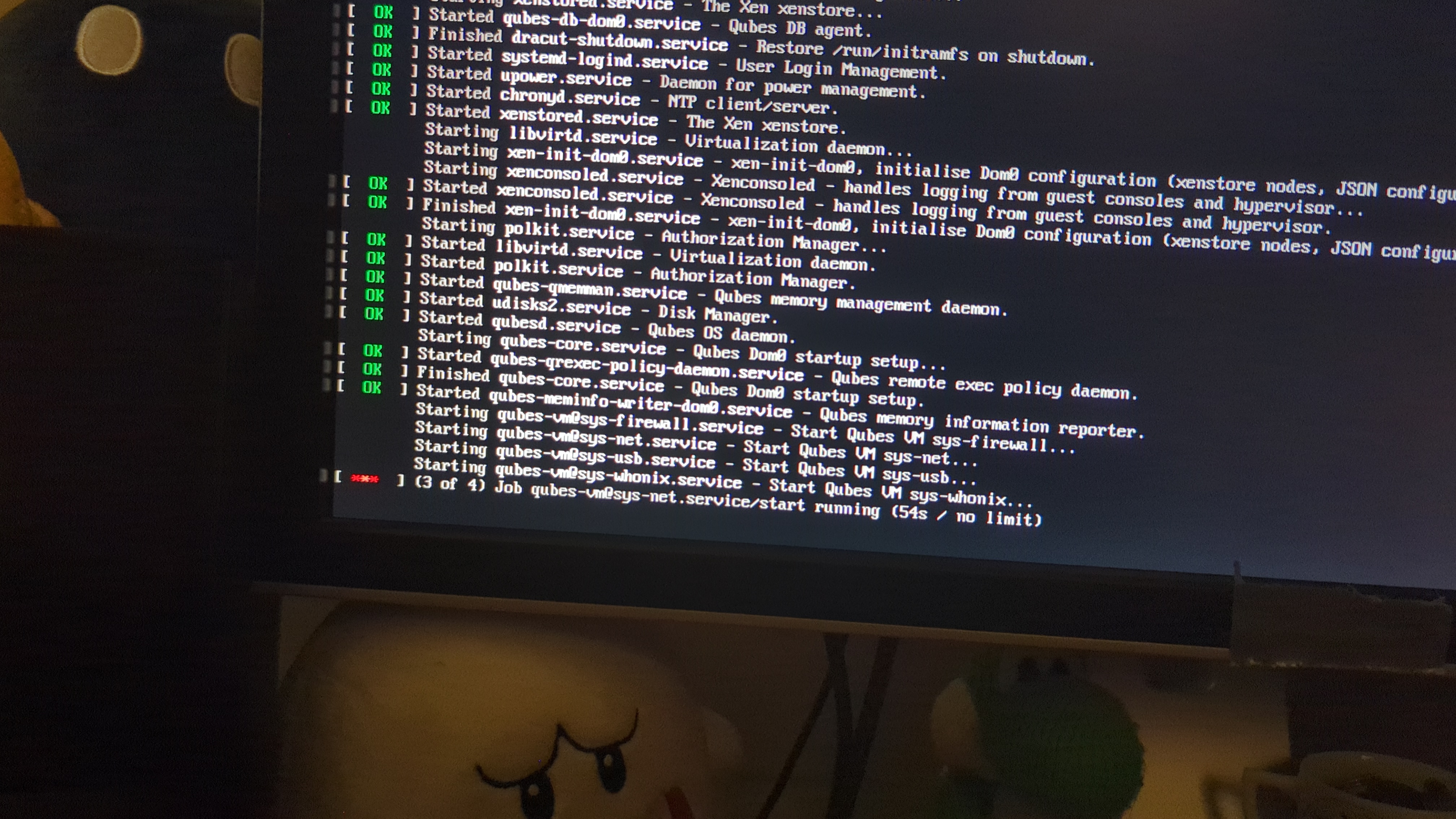 On Boot, “sys-usb”, " sys-net", “sys-firewall”, and " sys-whonix". I disaboed autostart on boot and i was able to use my keyboard but then i wasnt able to debug the issue properly