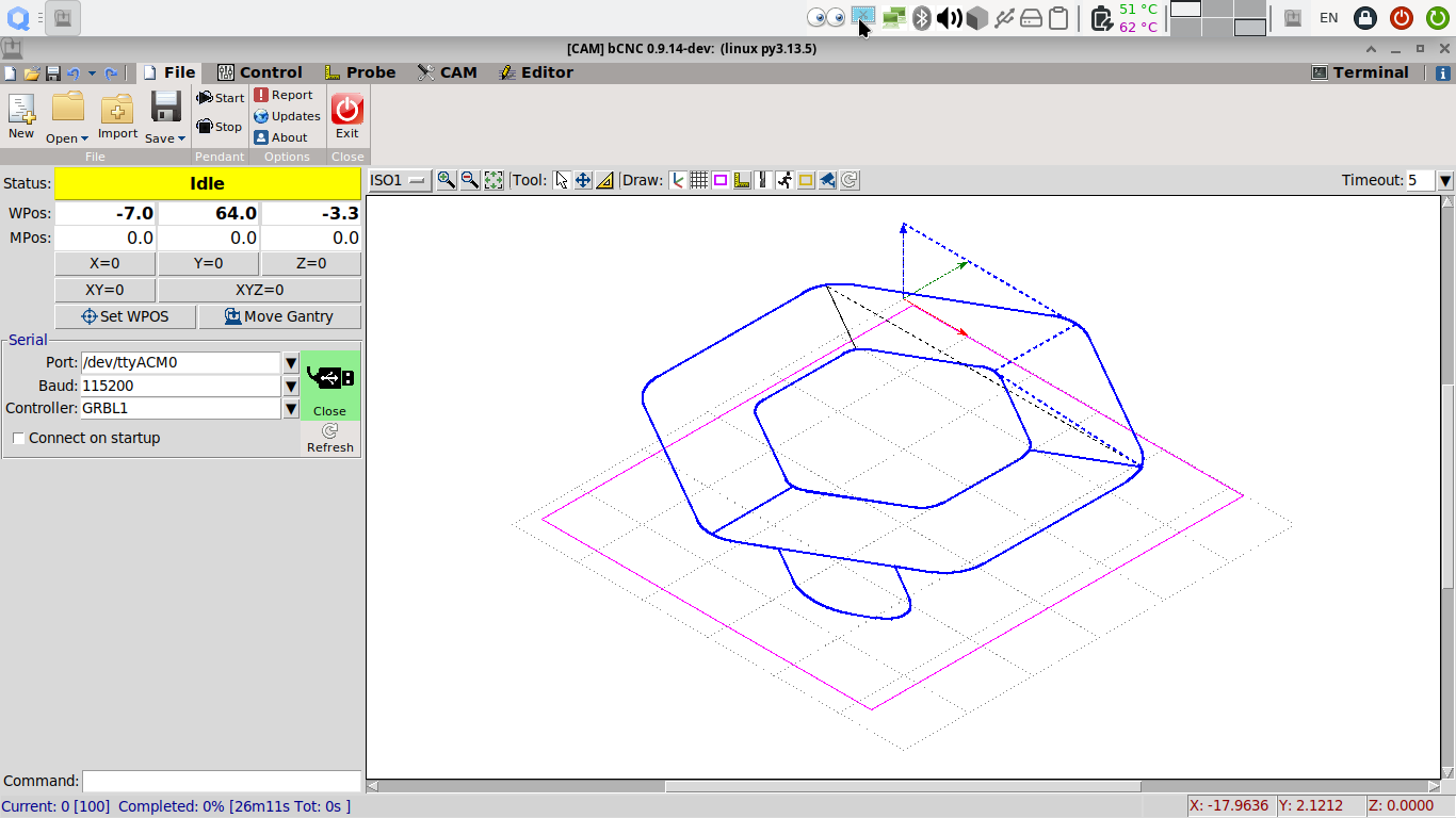 To allow bCNC (or other G-CODE sender software) to access the USB-to-Serial interface of the GRBL controller, it is necessary to add the user user to dialout group in the CAM qube’s template: