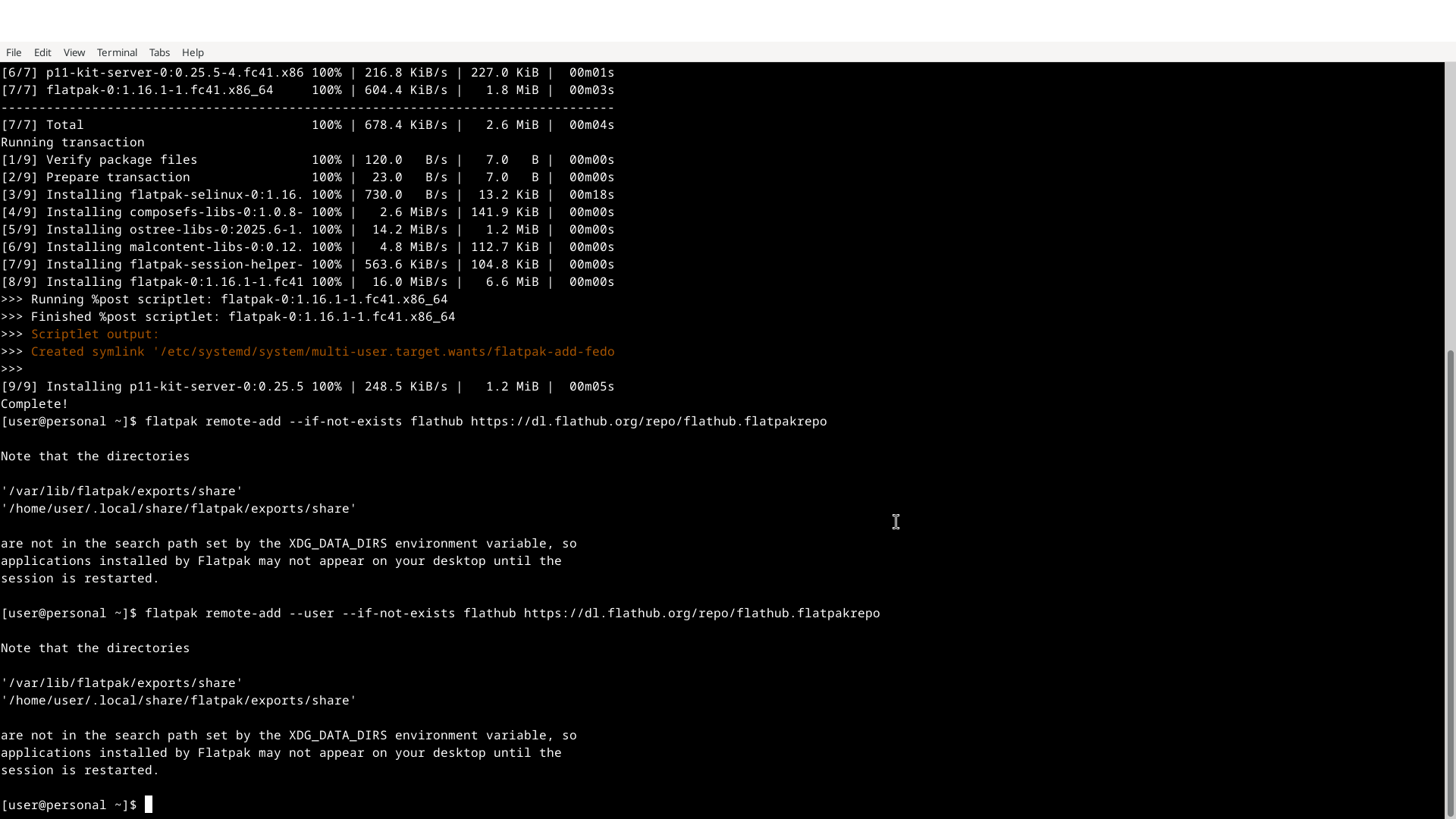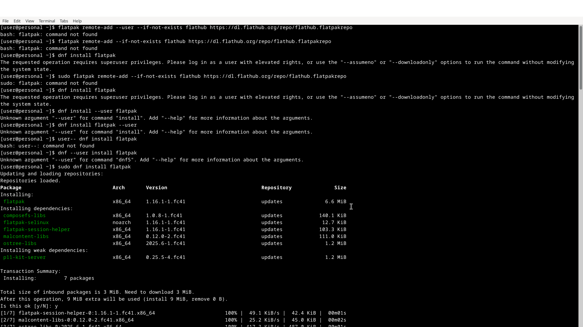 [user@fedora-42-xfce ~]$ sudo dnf install flatpak