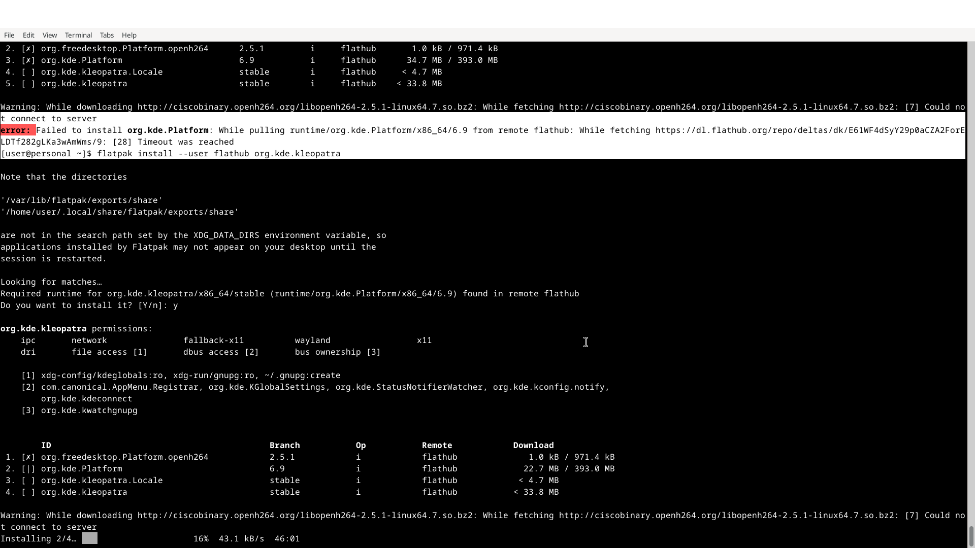 3. [✗] org.freedesktop.Platform.openh264 2.5.1 i flathub 294.1 kB / 971.4 kB