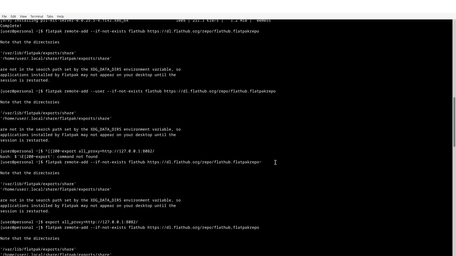 you know what ,nobody in the other post told me to type the command in the middle post above - $ export http_proxy=127.0.0.1:8082 and press enter then type flatpak remote-add --user --if-not-exists flathub https://dl.flathub.org/repo/flathub.flatpakrepo … and i mean NOBODY never said type that export line what does that do ??