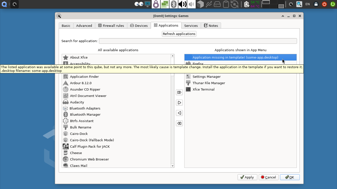 While the above screenshot is from development branch (with minor changes to the icons and search function), your original problem is what is mentioned by parulin and unman. You could take note of the missing App Name, installing it in the TemplateVM associated to the target qube. Then the issue will be solved.