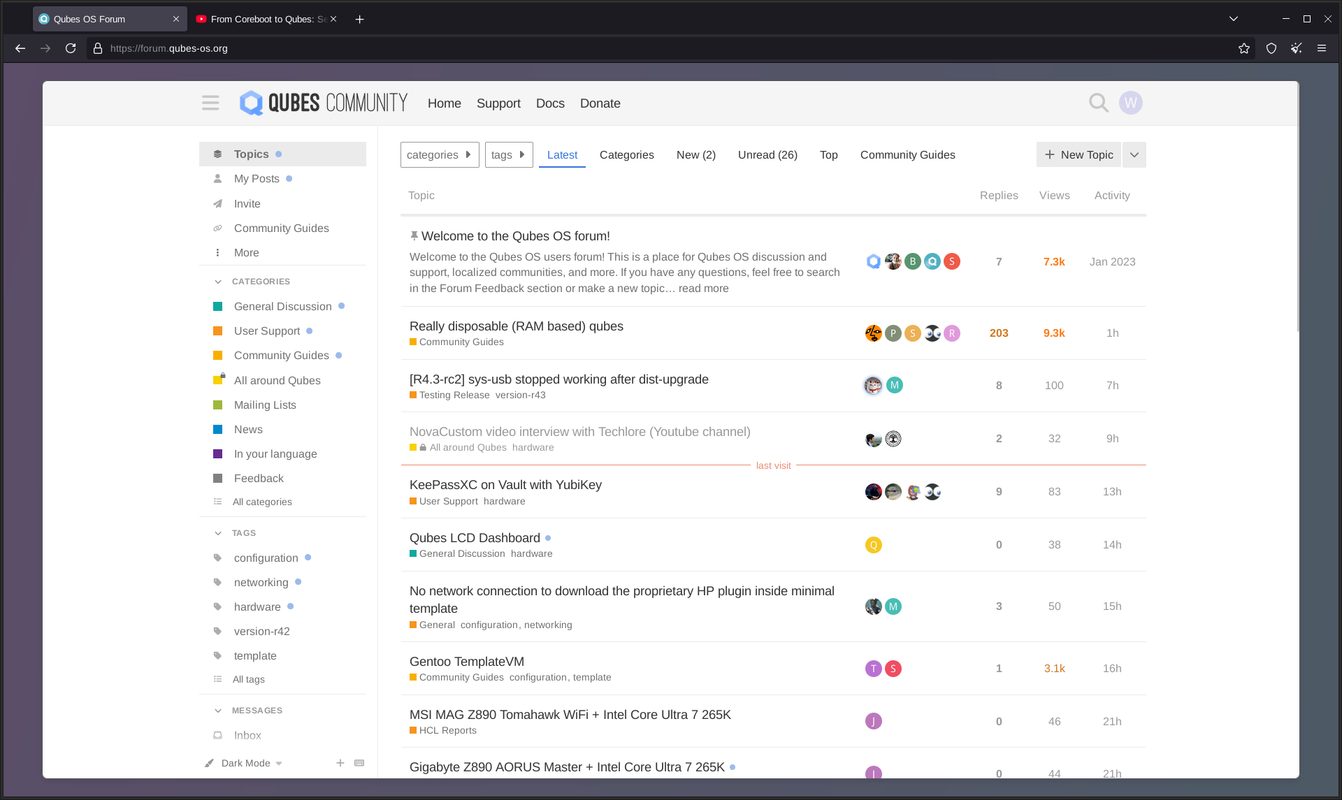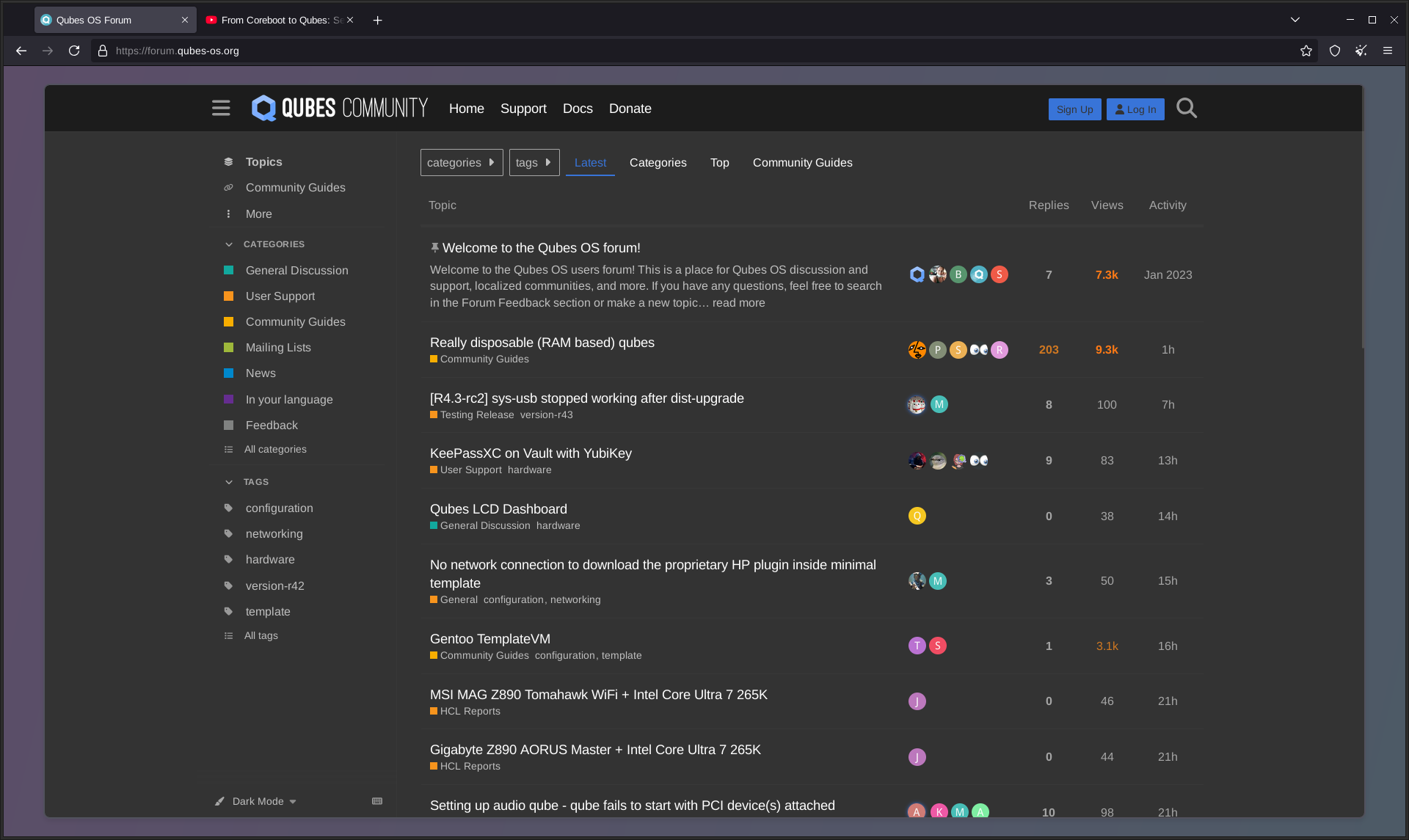 I compared the behaviour of the Qubes OS forum to the one of the Discourse forum. The Discourse forum theme switches automatically between dark and light mode based on the userās system setting while the Qubes OS forum does not.