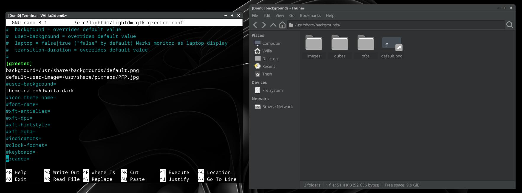lightdm-gtk-greeter-settings) increases dom0’s complexity and attack surface. If you prefer minimal dom0 changes, stick to the manual config‑file method.