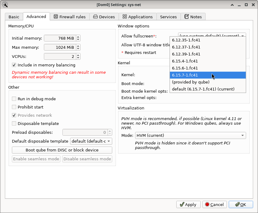 And in sys-net config, select one of the 6.15 kernels in the drop-down list. Like picture below: