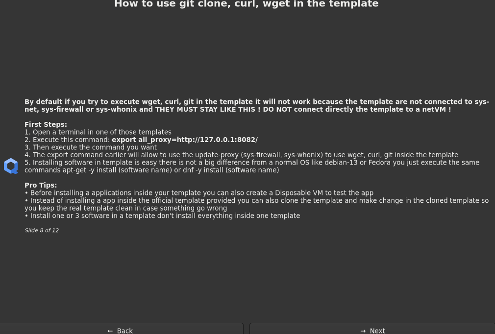[8_content]="<b>By default if you try to execute wget, curl, git in the template it will not work because the template are not connected to sys-net, sys-firewall or sys-whonix and THEY MUST STAY LIKE THIS ! DO NOT connect directly the template to a netVM !</b>\n\n<b>First Steps:</b>\n1. Open a terminal in one of those templates\n2. Execute this command: <b>export all_proxy=http://127.0.0.1:8082/</b>\n3. Then execute the command you want \n4. The export command earlier will allow to use the update-proxy (sys-firewall, sys-whonix) to use wget, curl, git inside the template\n5. Installing software in template is easy there is not a big difference from a normal OS like debian-13 or Fedora you just execute the same commands apt-get -y install (software name) or dnf -y install (software name)\n\n<b>Pro Tips:</b>\n⢠Before installing a applications inside your template you can also create a Disposable VM to test the app\n⢠Instead of installing a app inside the official template provided you can also clone the template and make change in the cloned template so you keep the real template clean in case something go wrong\n⢠Install one or 3 software in a template don't install everything inside one template"