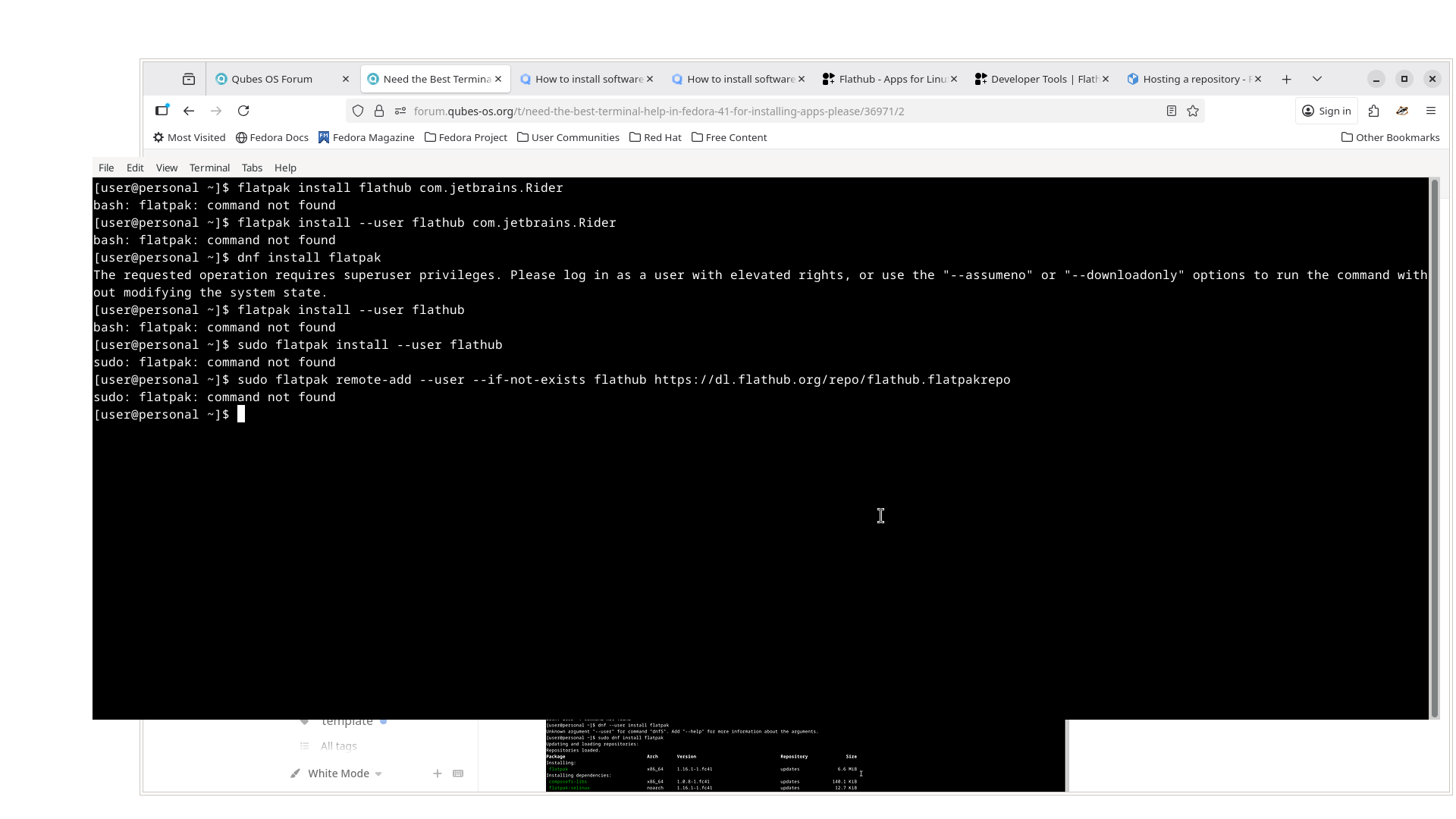 i’m having a hard time since last year, before these new updates with whonix and fedora i could install any apps on there , specifically from flatpak repository and flathub in the terminal… but now since i had to download qubes 4.2.2 with these new updates to whonix-17 and fedora 41 i can’t install no apps in terminal…i thought it was because of me coming from windows 11 but that’s not it…