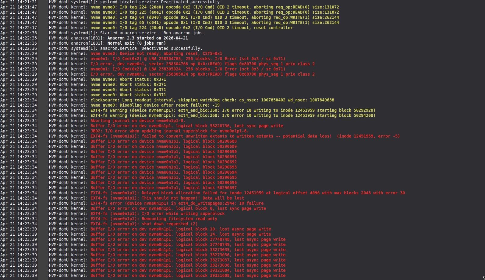 When the drive is attached to a HVM and I copy a large amount of data I can replicate the issue every time with a 20GB directory copy. The copy starts and continues for a little while, then stops. The journalctl in the HVM shows errors. Screenshots later. It will take some minutes, but eventually the journalctl displays more errors and a segfault. When that happens, the Qubes gets frozen for a hile, but then resumes. After that I can continue using Qubes normally, until I eventually get tired and close the HVM. When the HVM closes, Qubes crashes.