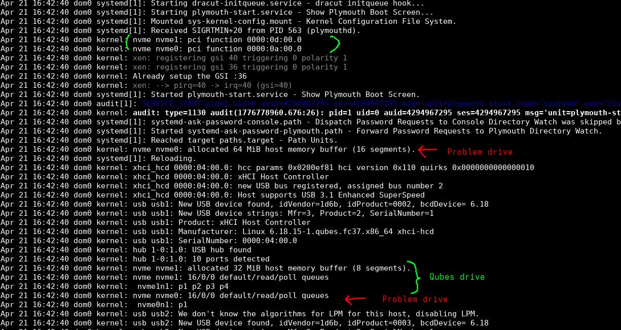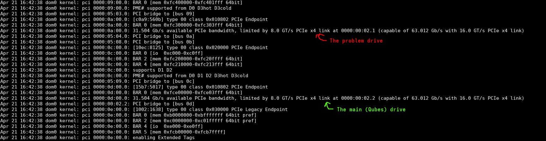 I’m pretty sure the setup used to work perfectly fine before in this same slot before I added new graphics card, the AMD one and one new USB card to a remaining PCIe slot. Only one slot remains empty, but it is not accessible. I moved the former number 1 nVidia card to the secondary slot. I cannot rule out Qubes updates, but my hunch is leaning towards the PCIe shuffle as the origin of the problems. But anyone who has done debugging or problem solving knows how much user hunch is worth on things they don’t understand. I hope I’m not misleading other users or future readers.