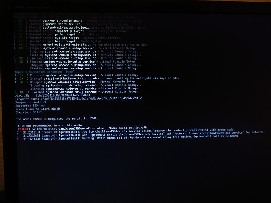 - When trying to select “Test the medium and install Qubes” in the boot menu, the following error message appeared after approximately 4% of the check (see image):