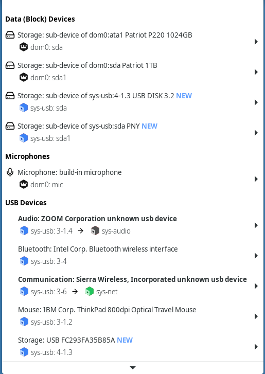 - Connecting only one partition (sys-usb:sda1 in the example picture). Unfortunately for this example, some file managers (e.g. XFCE’s Thunar) might not recognize them and you have to manually mount them from the command line.