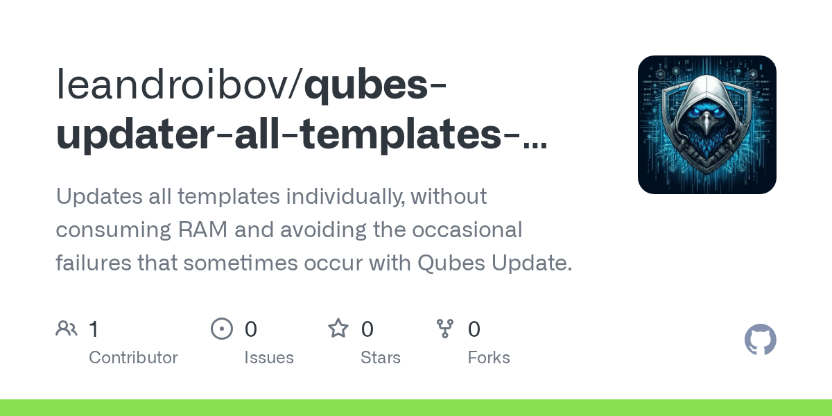 It’s a script intended to be placed in /bin on dom0 so that, just by typing a command in the dom0 terminal, you can start updating every template currently present in the system. It can be run with sudo ./updater.sh! The script updates the templates one at a time, not several simultaneously. The problem with Qubes’ built‑in updater is that it opens a bunch of templates perhaps four or five at once consuming a lot of RAM. Moreover, it fails many times, and the usual fix is to open each template manually and run sudo apt update and sudo apt upgrade.
