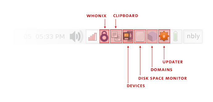 In the system tray: the only not mentioned icon is the Network Manager from your sys-net.