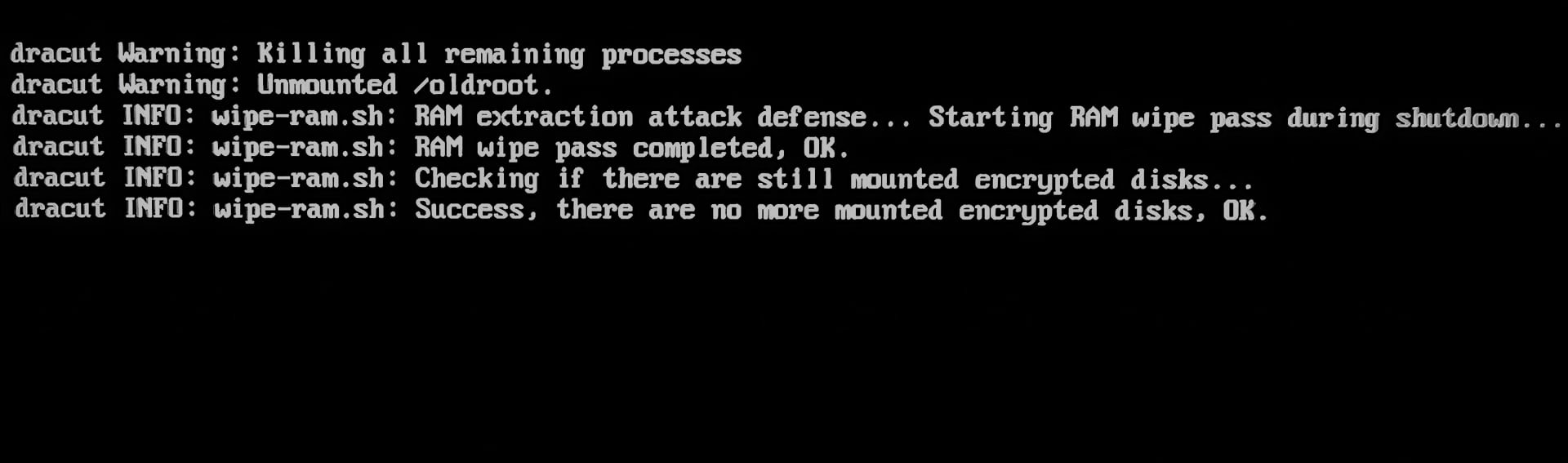 This guide also adds the Ram‑Wipe module to wipe memory after shutdown. This tool is used by Tails and Kicksecure / Whonix to wipe memory for protection against forensics.