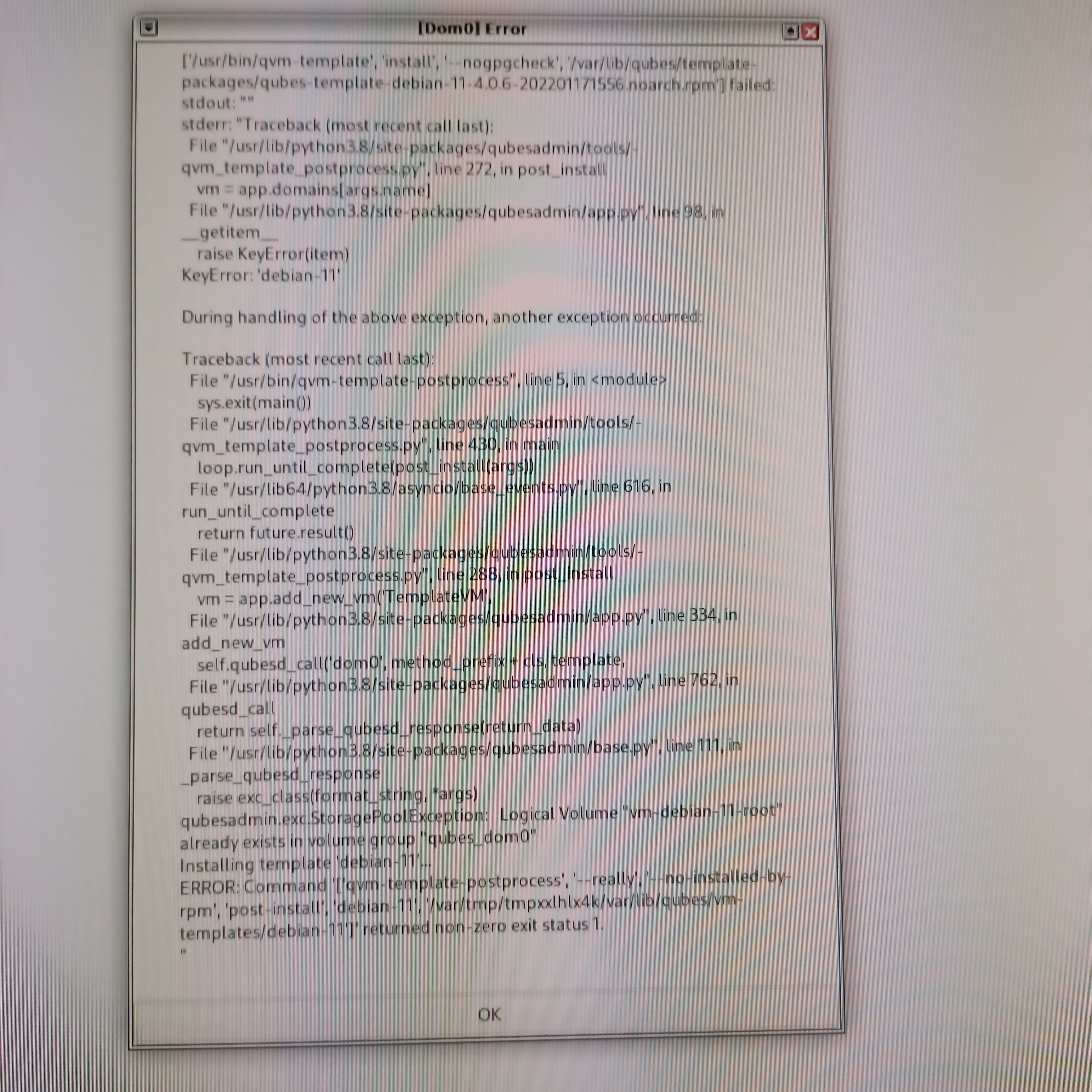 Next it's recommended to reformat the root snd boot filesystems, but noting got the LVs. So ehen trying to install the debian-11 template it failed, template installation was aborted, snd I found to way to resume or restart. See attachment. So I restarted everything, also deleting the LVs for the VMs (which is not easy from the installation environment).