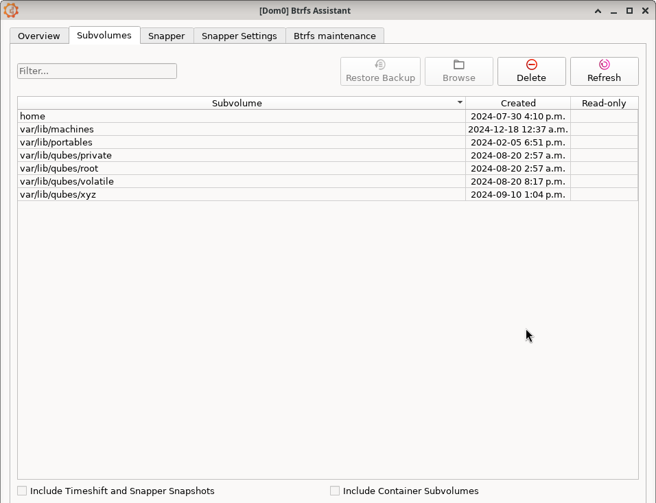 I did not create a btrfs subvolume, now I think I should have done a subvolume for / , one for /var/lib/qubes and one for /home