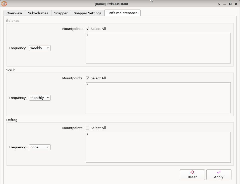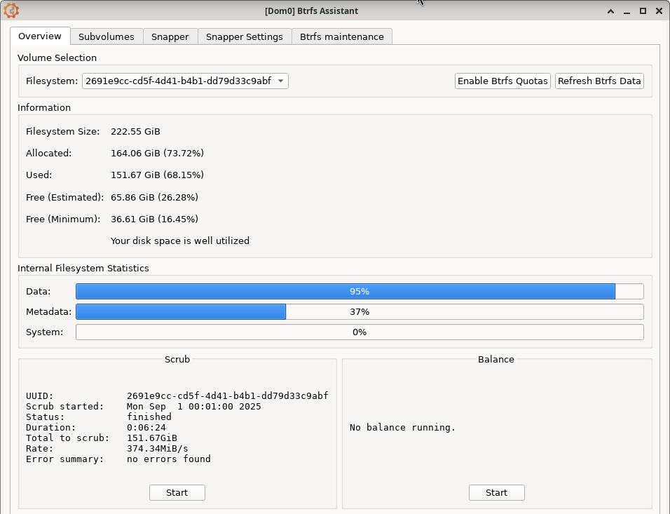 BTW, I would recommend taking a look at Btrfs Assistant GUI while you are testing. It would be very convenient for 1st time Btrfs users. Or at least, it would provide good screenshots for educational purposes and help the community understand it better.