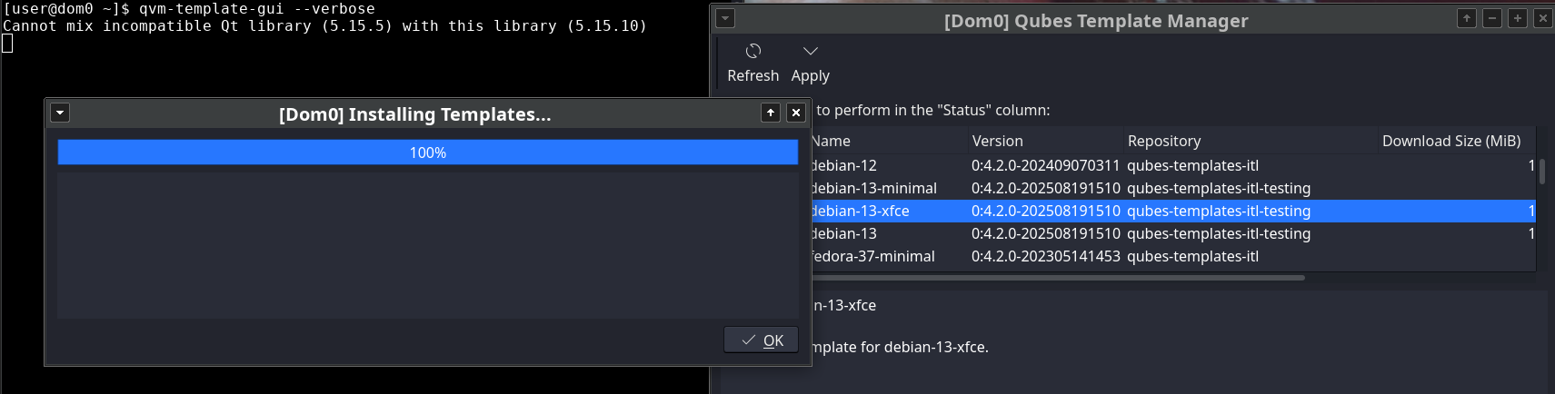 Hello. I’m getting this error. I’ve always installed templates via the terminal, but I decided to try the template manager. When I run qvm-template-gui --verbose and attempt to install a template, only one line appears: