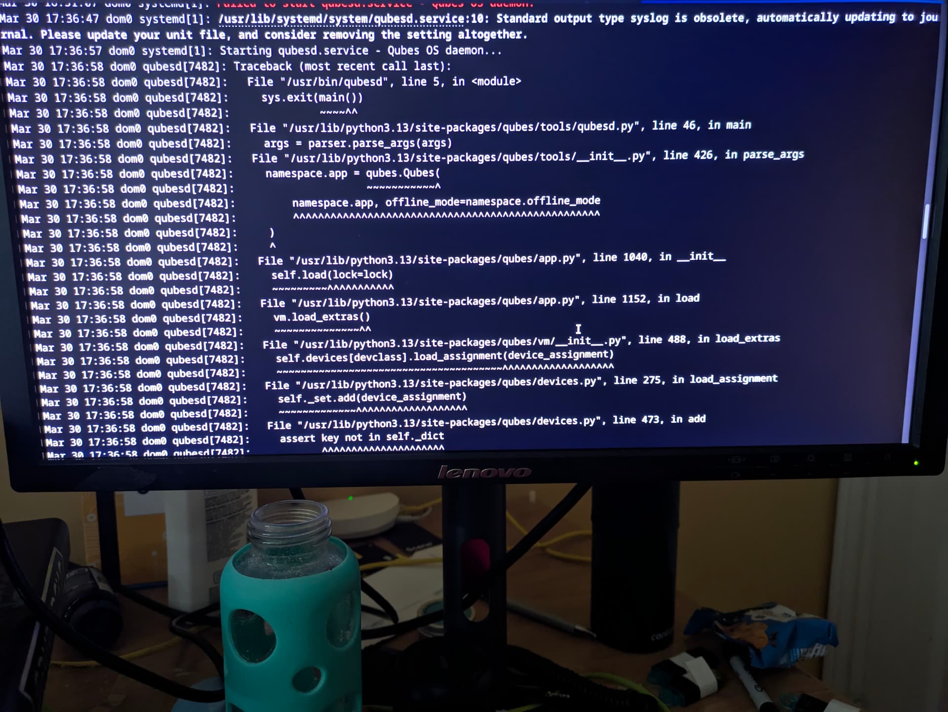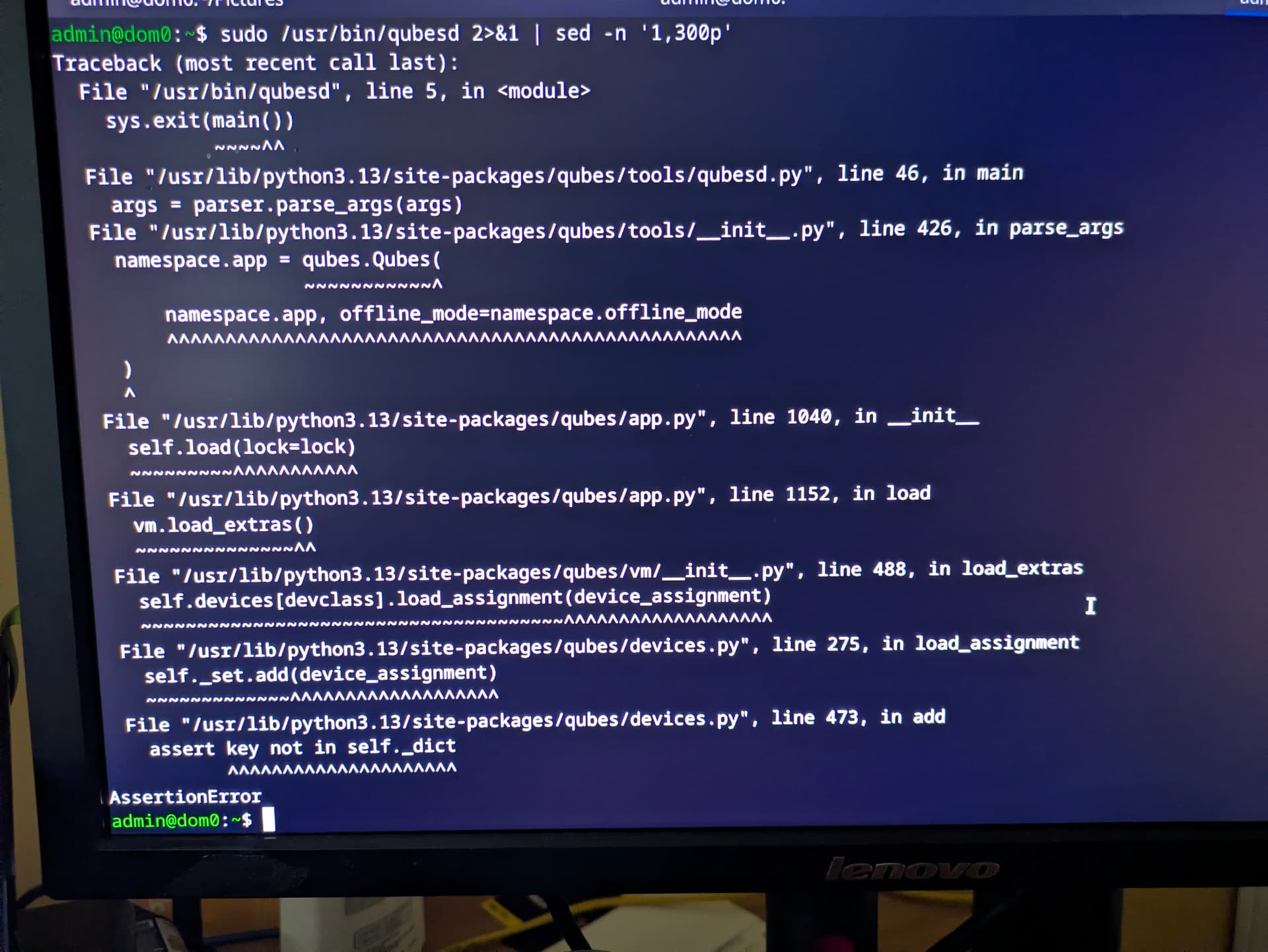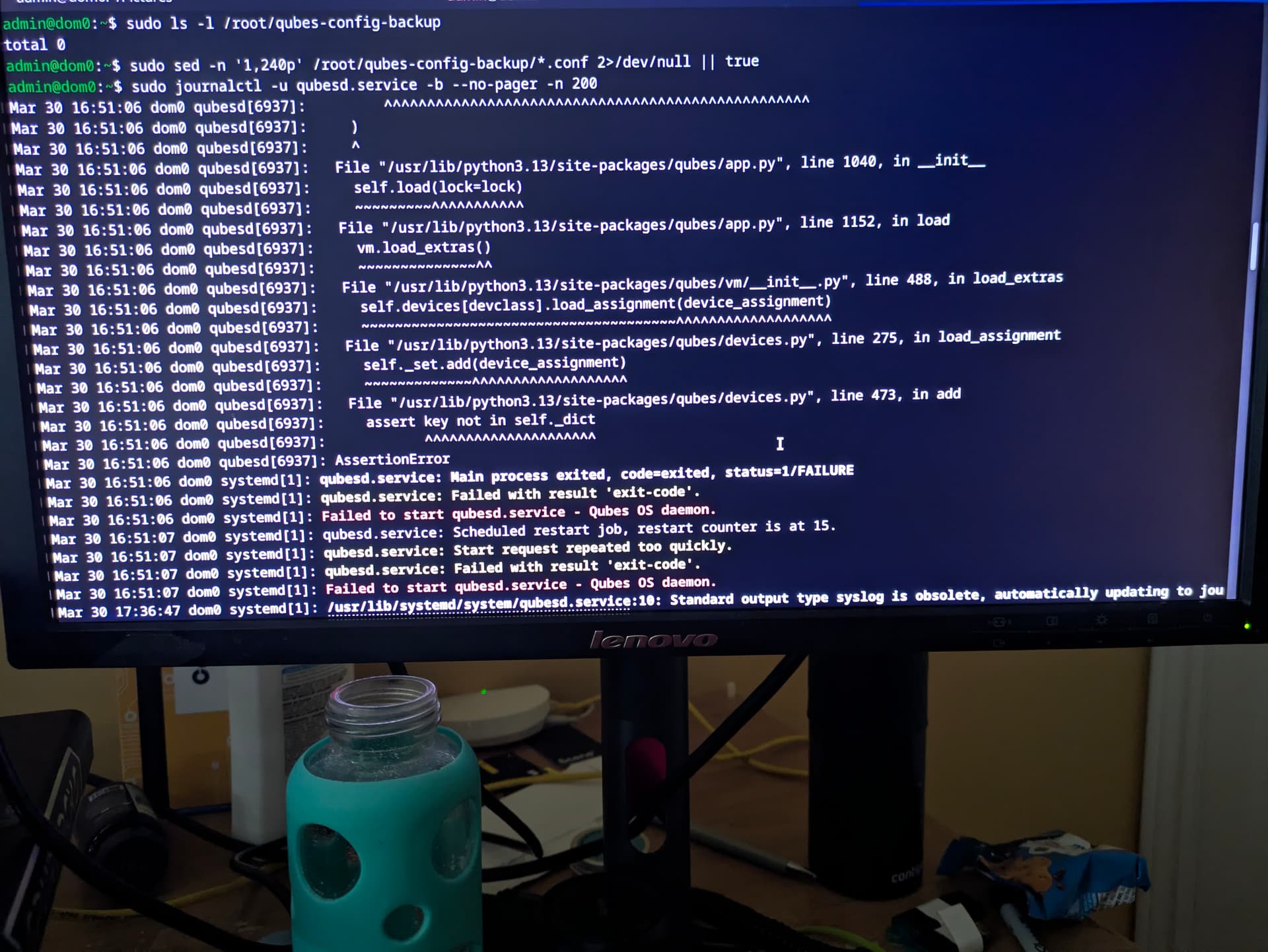 admin@dom0:~$ sudo sed -n '1,240p' /root/qubes-config-backup/*.conf 2>/dev/null || true admin@dom0:~$ sudo journalctl -u qubesd.service -b --no-pager -n 200 Mar 30 16:51:06 dom0 qubesd [6937]: Mar 30 16:51:06 dom0 qubesd [6937]: Mar 30 16:51:06 dom0 qubesd [6937]: Mar 30 16:51:06 domo qubesd [6937]: Mar 30 16:51:06 dom0 qubesd [6937]: Mar 30 16:51:06 dom0 qubesd [6937]: Mar 30 16:51:06 dom0 qubesd [6937]: Mar 30 16:51:06 domo qubesd [6937]: Mar 30 16:51:06 dom0 qubesd [6937]: Mar 30 16:51:06 dom0 qubesd [6937]: Mar 30 16:51:06 dom0 qubesd [6937]: Mar 30 16:51:06 dom0 qubesd [6937]: Mar 30 16:51:06 dom0 qubesd [6937]: Mar 30 16:51:06 dom0 qubesd [6937]: Mar 30 16:51:06 dom0 qubesd [6937]: Mar 30 16:51:06 dom0 qubesd [6937]: Mar 30 16:51:06 dom0 qubesd [6937]: Mar 30 16:51:06 dom0 qubesd [6937]: Mar 30 16:51:06 dom0 qubesd [6937]: AssertionError Mar 30 16:51:06 dom0 systemd[1]: qubesd.service: Main process exited, code=exited, status=1/FAILURE Mar 30 16:51:06 dom0 systemd[1]: qubesd.service: Failed with result 'exit-code'.
