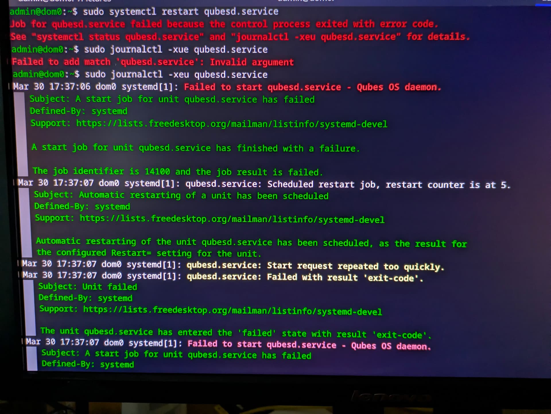 Mar 30 17:37:07 dom0 systemd[1]: qubesd.service: Failed with result 'exit-code'.