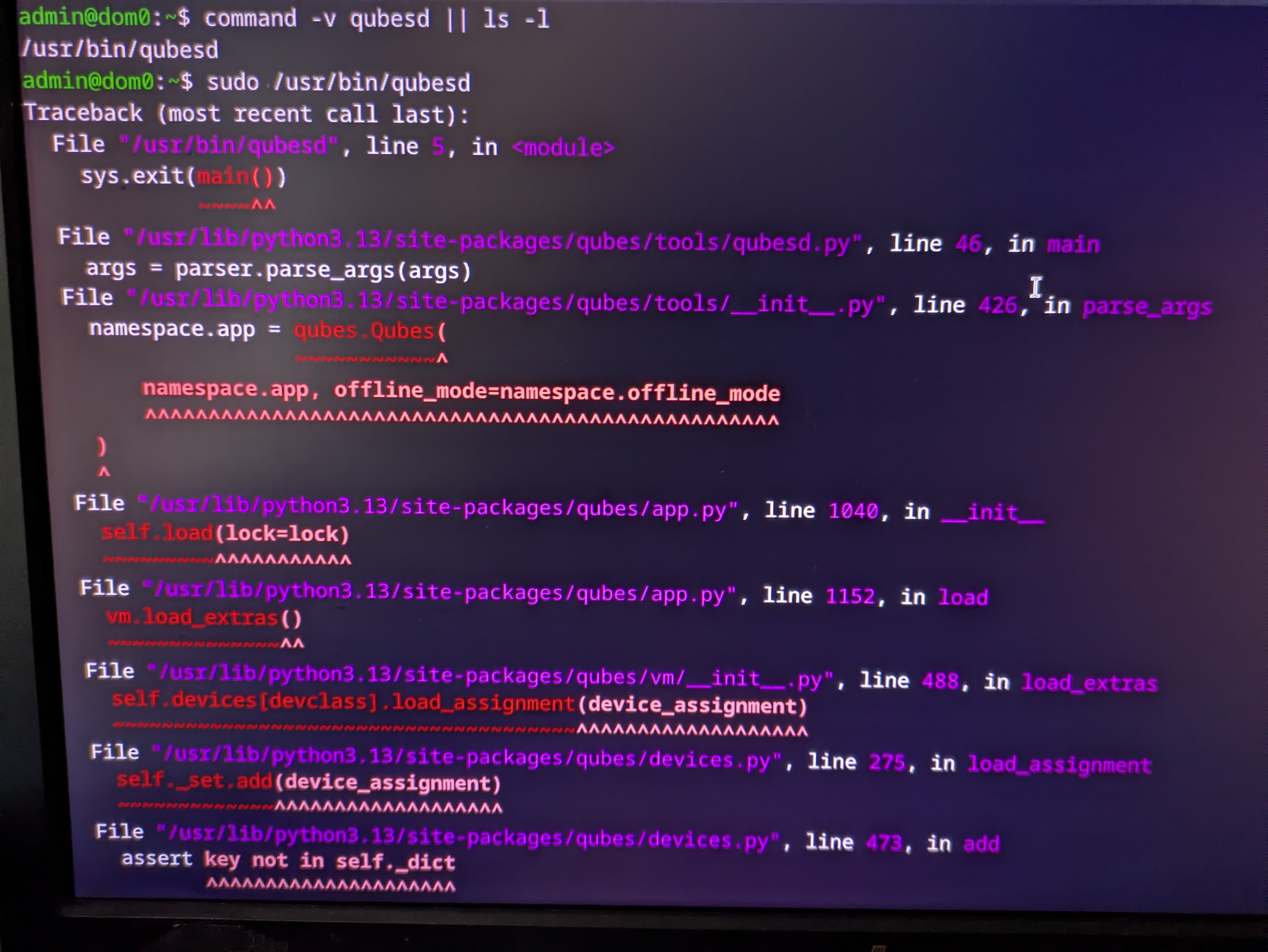admin@dom0:~$ sudo /usr/bin/qubesd 2>&1 | sed -n '1,300p' Traceback (most recent call last):