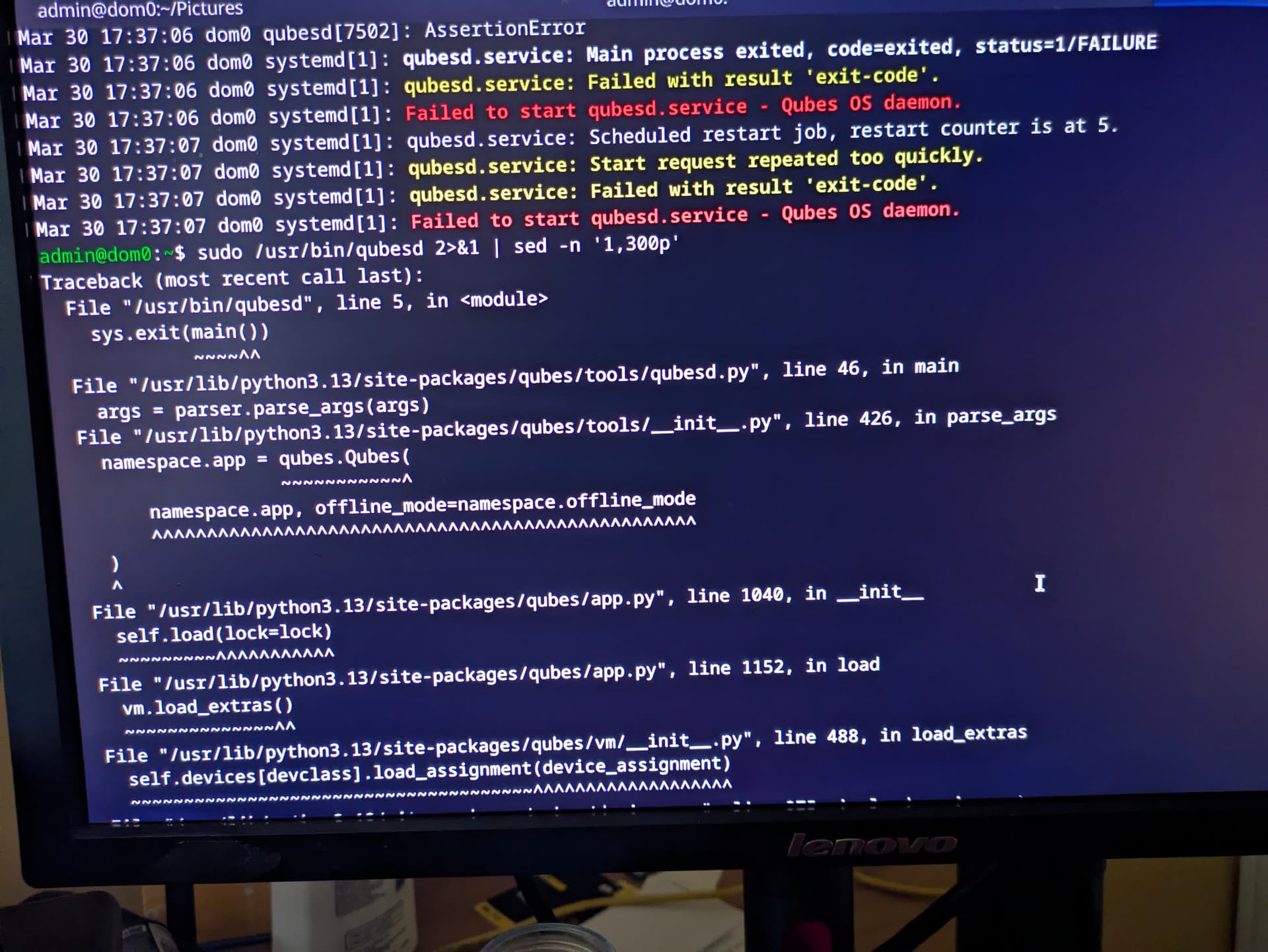 Mar 30 17:37:07 dom0 systemd[1]: Failed to start qubesd.service - Qubes OS daemon. admin@dom0:~$ sudo /usr/bin/qubesd 2>&1 | sed -n '1,300p'