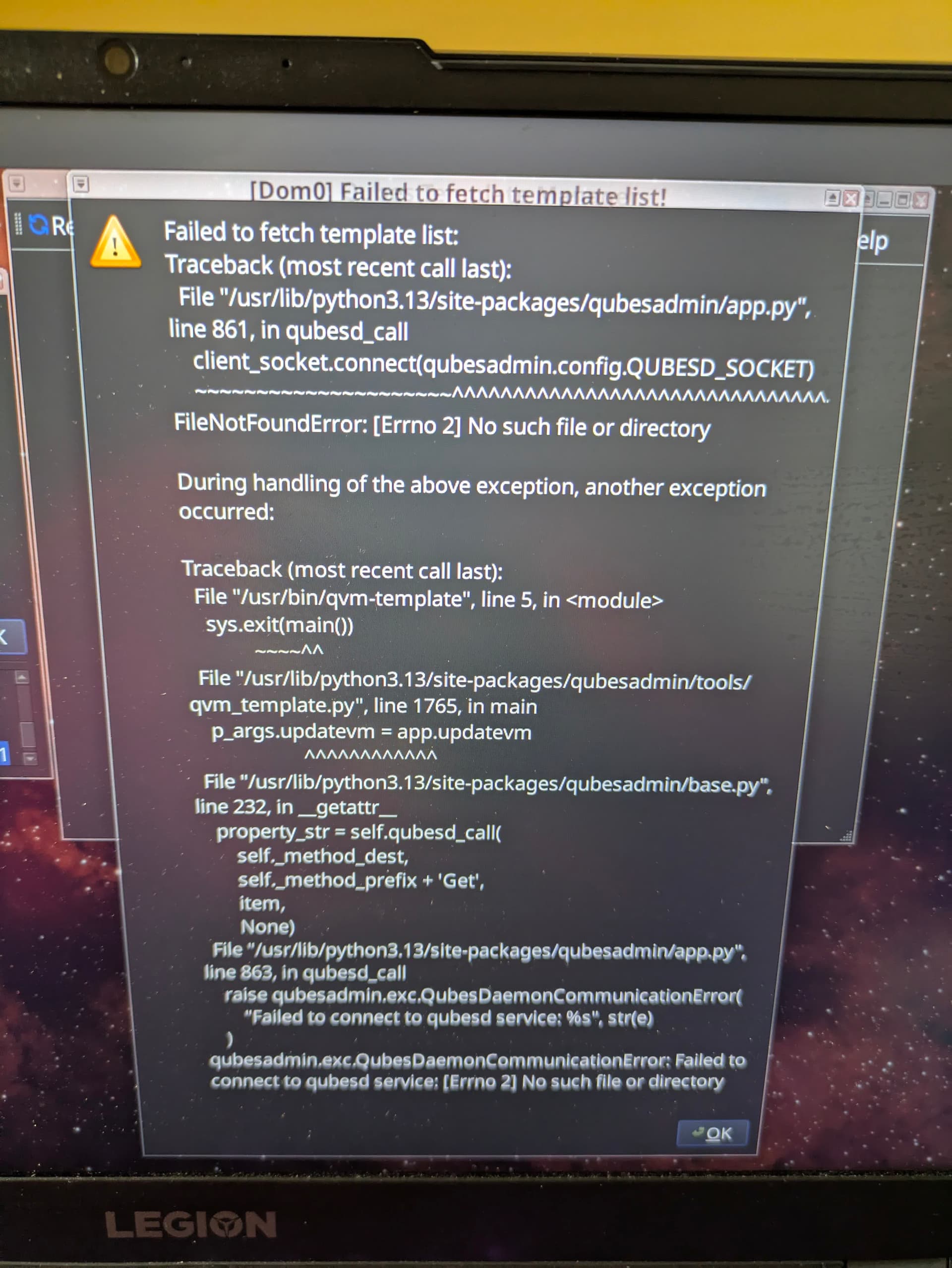 For context, I have upgraded from qubes 4.2 to qubes 4.3 by completely reinstalling qubes for 4.3 from a USB stick. I restored everything from Q’s 4.2 from my backup. Everything was working fine until I restarted my computer. The USB mice and keyboard still work, however nothing else works. In the screenshots below, I have tried to open restore qubes application and qubes template manager. The qubes manager does not open at all.