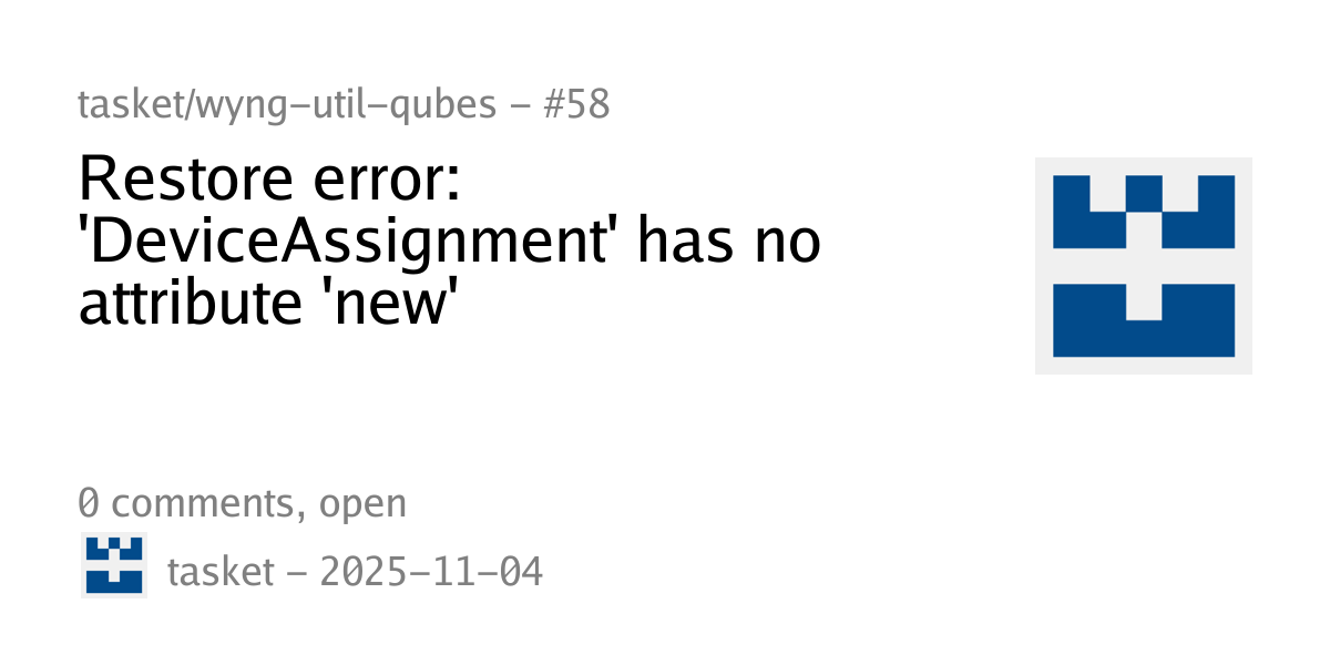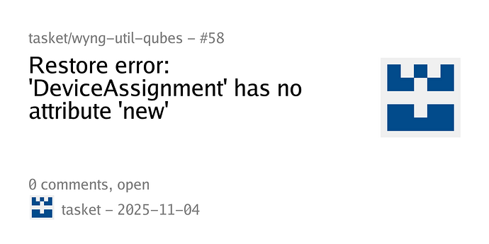 Otherwise, you can try an updated version of the util in the testing branch here. It will skip the device assignment if an error occurs. This will leave sys-net with no devices and a “backup-restore-in-progress” tag that prevents it from starting; you can manually assign the net devices on the VM’s Devices tab and remove the tag this way in dom0: qvm-tags sys-net del backup-restore-in-progress