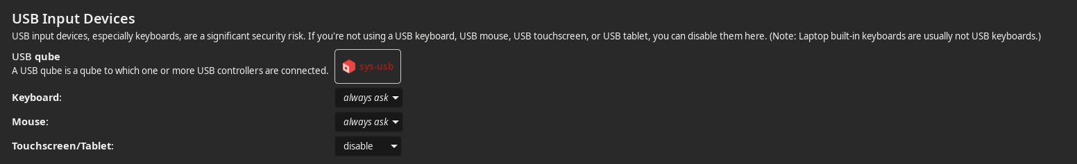 I then followed advice from posts in this thread to set keyboard and mouse to ‘always ask’ in Qubes Global Config USB Devices settings.