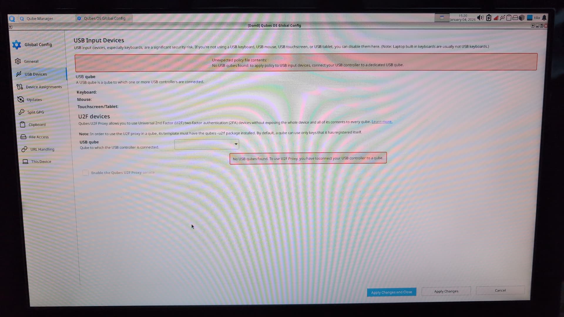 Ensured that “rd.qubes.hide_all_usb” is not in /etc/default/grub